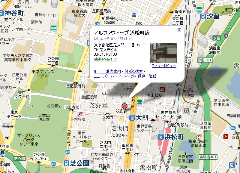 文化放送を向かって左へ。大門の交差点を過ぎ、芝神明商店街の入り口、モスバーガーの上にある。